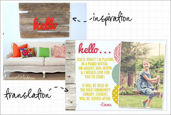 So the inspiration and the invitation are similar but not the same. They have the same font, Pacifico. They both have brighter, contrasting colors, patterns and wood/wood grain element.